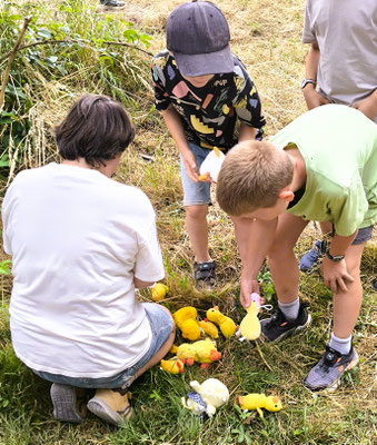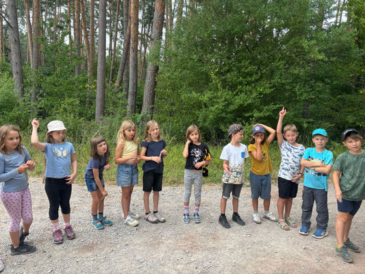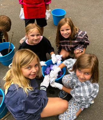 Zum Glück war es am nächsten Tag deutlich kühler, und alle starteten vormittags zur Wanderung durch den nahegelegenen Wald. Nach dem Mittagessen stand zu einen eine Heckenexkursion mit dem Bund Naturschutz, zum anderen das Batiken von T-Shirts auf dem Programm. Beides hat den Kindern sehr viel Spaß gemacht, und es sind tolle bunte Shirts entstanden.