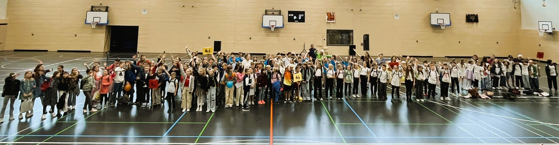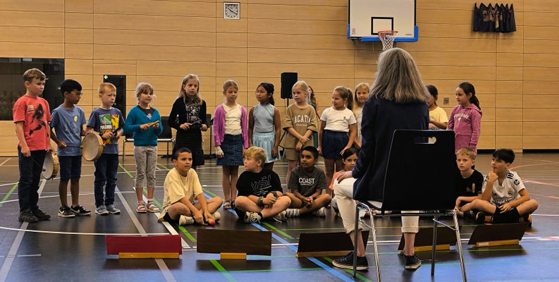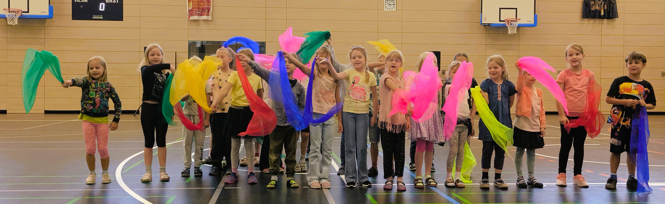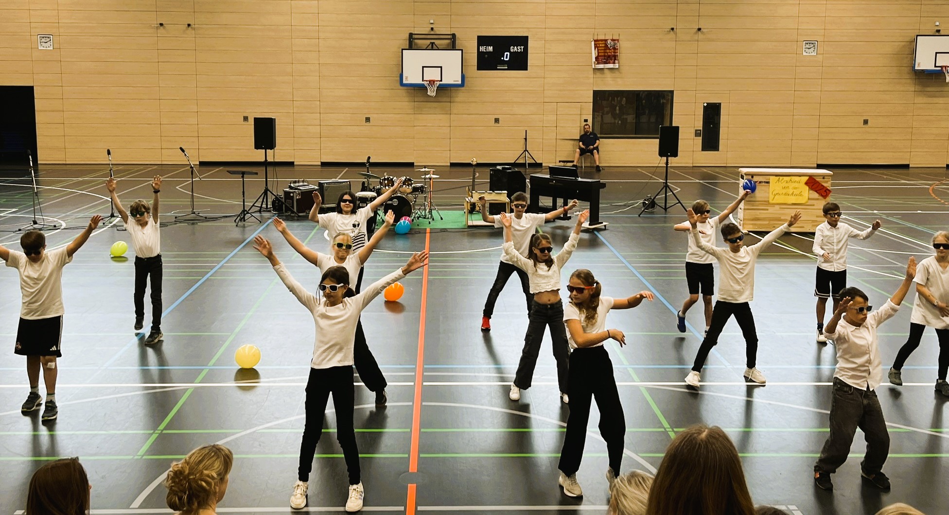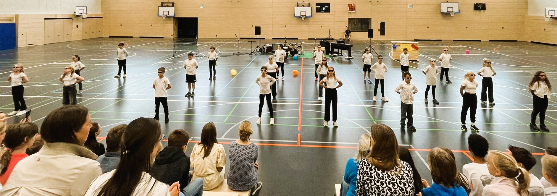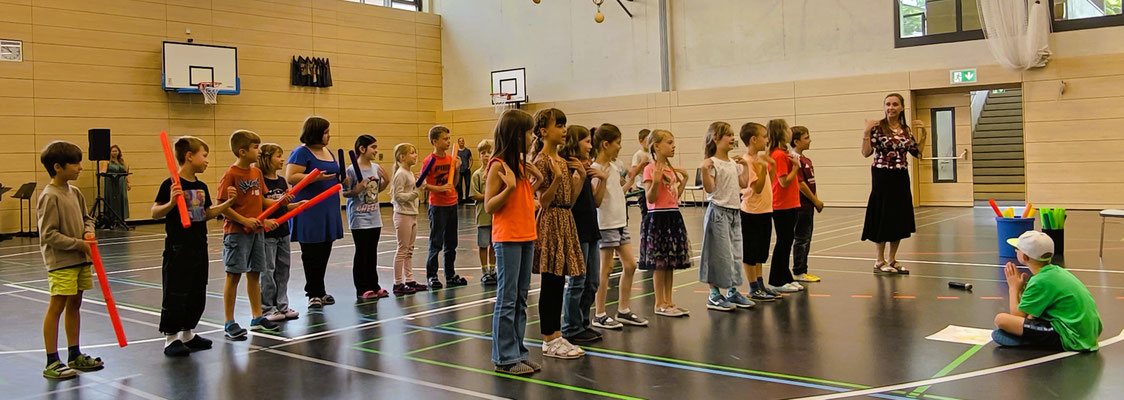 präsentierten diese erstmals nicht in der Aula sondern in der großen Mehrzweckhalle. Da waren bunte Tücher und Boomwhackers genauso im Einsatz wie Orffsche Instrumente und Springseile, und die