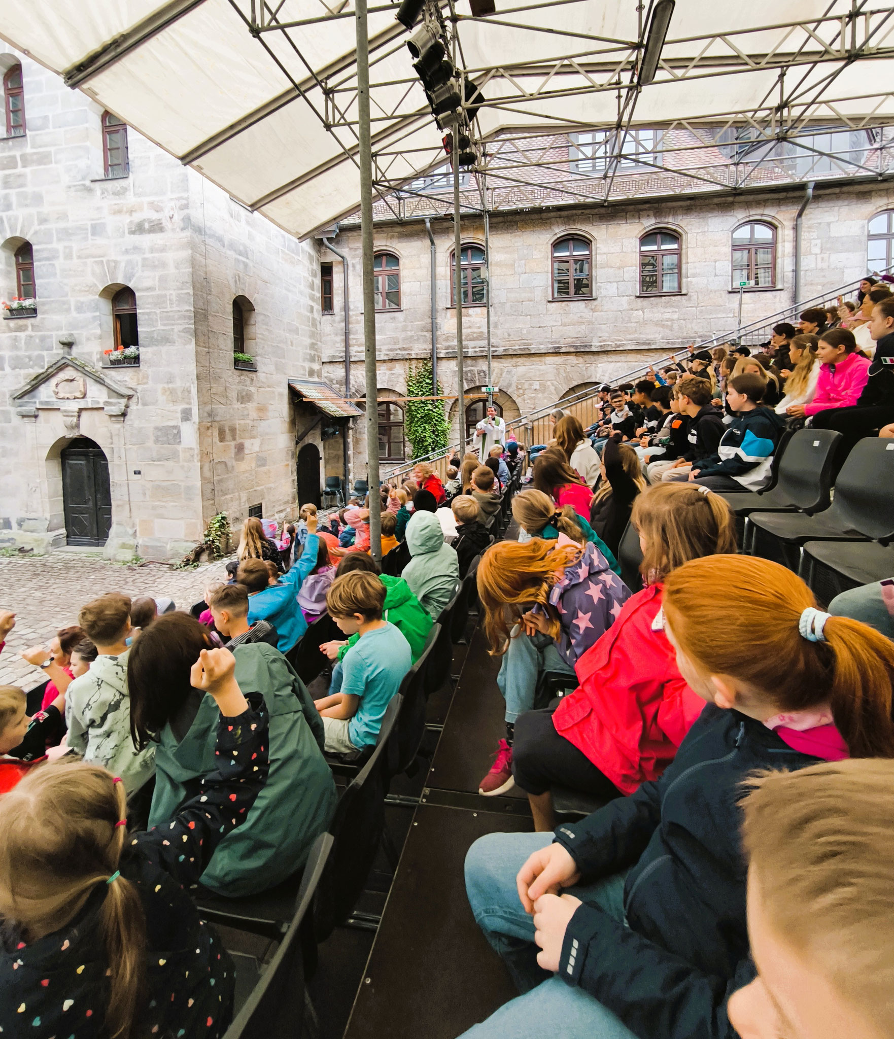 In diesem Jahr hat die Grundschule Altdorf zum ersten Mal die Tribüne, die für die Wallenstein-Festspiele im historischen Hof des Wichernhauses aufgebaut war, für einen großen gemeinsamen Abschlussgottesdienst aller Kinder und Lehrkräfte genutzt. Denn, das machten die beiden Pfarrer Dominik Pillmayer und Bernd Popp schnell klar: Gott ist überall bei uns, nicht nur in der Kirche. Er ist auch dabei, wenn es in den Ferien bald für viele auf die Reise geht, er beschützt uns, auch in schwierigen Zeiten, und zeigt uns den Weg. Das veranschaulichten die Pfarrer an der Geschichte von Jona im Bauch des Wals, für die beide in große blau-weiße BubbleSoccer schlüpften.