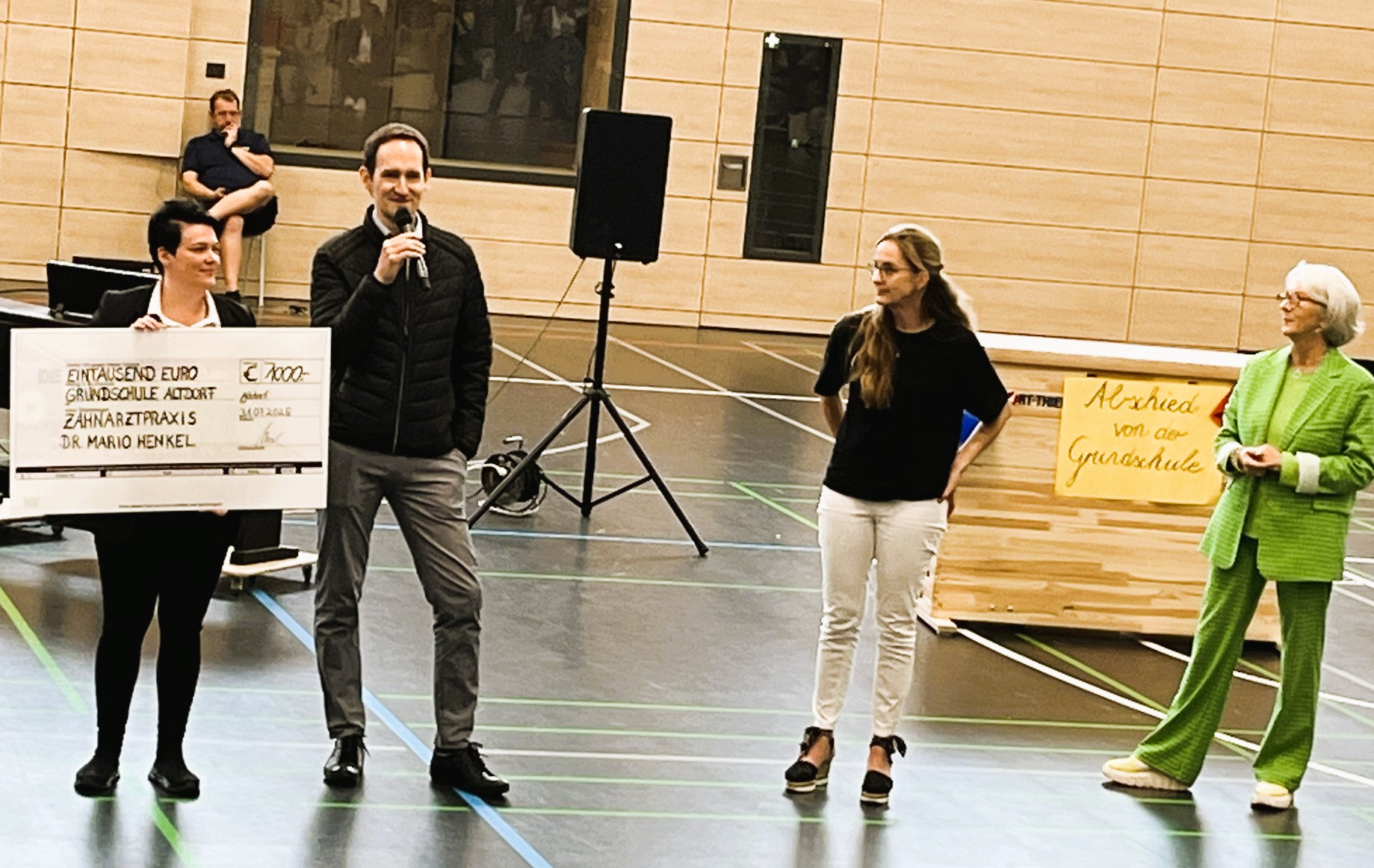 Nach einem gemeinsamen Abschlusslied zogen die rund 120 Noch-Viertklässler durch ein Spalier der jüngeren Klassen von der Halle in den Pausenhof. Dort erhielten sie ein ganz besonderes Abschiedsgeschenk, das die großzügige 1000 Euro-Spende der Zahnarzpraxis Dr. Mario Henkel aus Altdorf ermöglicht hatte. Jedes Kind bekam einen mit Feierbrause gefüllten, nachhaltigen To-Go-Becher mit Grundschullogo, mit dem die Schüler und Schülerinnen auf dem Hof gemeinsam anstoßen konnten: auf all das Schöne, das war - und auf all das Spannende, was kommen mag!