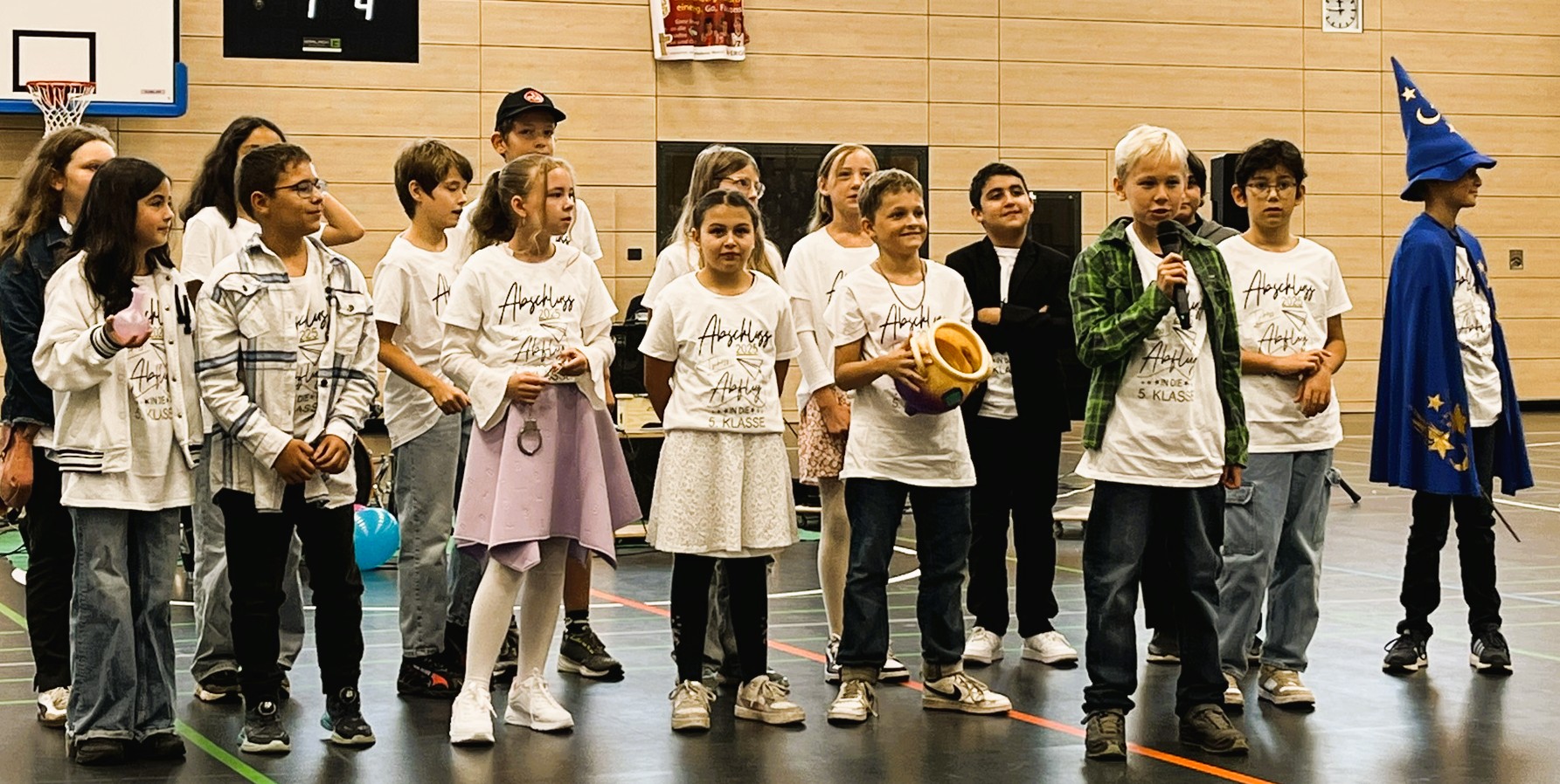 Alle Klassen hatten einen eigenen Programmpunkt vorbereitet, den sie Eltern, Geschwistern und Lehrkräften in der Mehrzweckhalle vorführten, dazu kleine Rückblicke und persönliche Dankesworte am Ende dieser vier Jahre: Die 4a erweckte sehr amüsant James Krüss' Zauberer Korinthe zum Leben, während die 4b dem Abschied mit ihrer teils selbstgedichteten Version von "Don't worry, be happy" wunderbar den traurigen Unterton nahm. Mit Sonnenbrille und ganz in schwarz-weiß zeigte dann die 4c eine mitreißende Choreographie zu "Dance Monkey", bevor die 4d mit beeindruckender Percussion-Performance samt Gesang zum sogenannten Cup Song "When I'm gone" an der Reihe war. Der äußerst treffende Sketch "Die verrückte Klasse" von der 4e sorgte für reichlich Lacher, und die 4f wartete sogar mit einer richtigen Schulband auf: Monatelang hatten die sieben Mitglieder von "Rocketfuel" mit tatkräftiger Unterstützung von Heilpädagoge Leo Kalavrouziotis geprobt, komponiert und getextet und spielten nun - unterstützt vom Klassenchor ihrer Mitschüler - den eigenen Song "Grundschulzeit" vor völlig begeistertem Publikum.